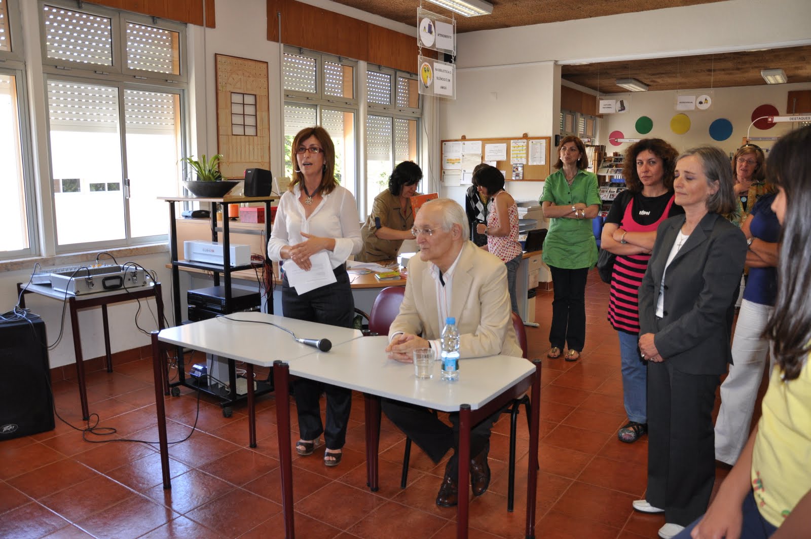 Corolário da exposição Conto vai...Conto Vem..., a BECRE abriu as suas portas para receber o ilustre autor da "Avó Palhaça" que fez as delícias das suas contadoras, Ana Caetano e Ana Nascimento, e deu origem ao rol de textos que preencheram as paredes da exposição de final de ano. Para o acolher em grande, o 8ºA, a Beatriz do 5.ºA, a direcção da escola e muitos docentes que quiseram ver de perto o escritor. As questões surpreenderam pela sua pertinência e seriedade de conteúdo e formulação; os alunos, pela sua atitude inebriada bebendo as palavras vividas do ex-jornalista e escritor.