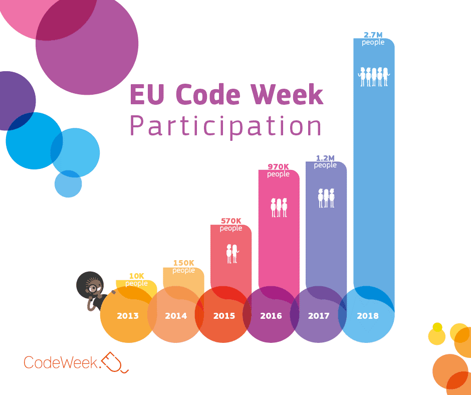 O que é a Semana Europeia da Programação (EU Code Week)? É um movimento popular levado a cabo por voluntários e apoiado pela Comissão Europeia que visa levar competências básicas de programação e literacia digital a todos de uma forma divertida e atrativa, e, como se pode constatar pelo gráfico, não pára de crescer.