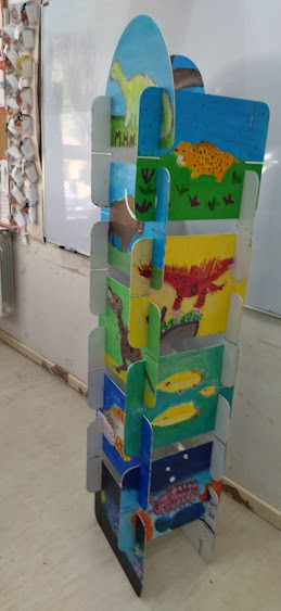 Sequencialmente, na ordem da timeline, começando-se pelas placas que representam a Terra incandescente, depois as placas do período Paleozóico, etc., cada aluno trouxe a sua placa, apresentou-a à turma explicando o que pintou e acrescentou-a ao totem.